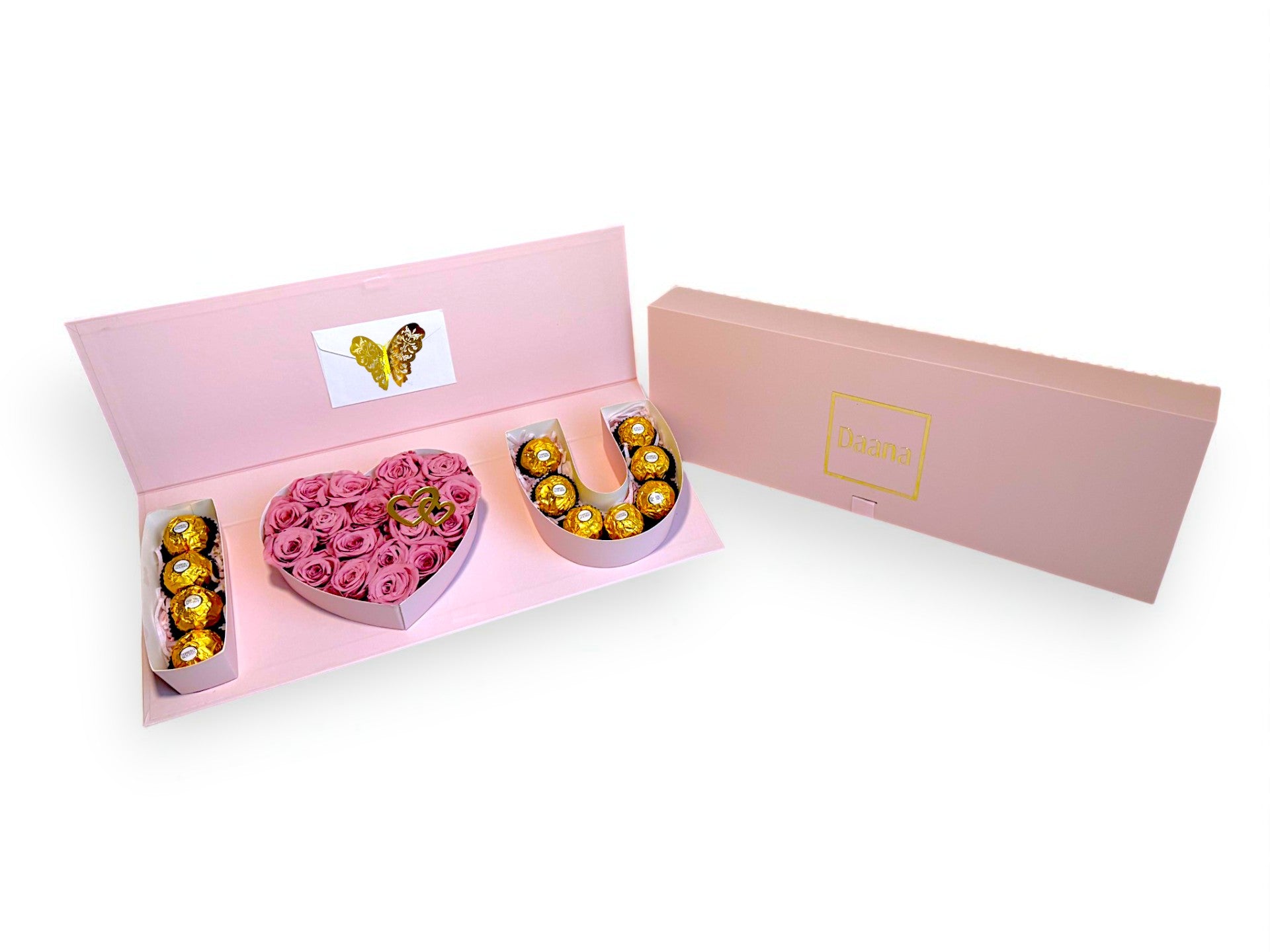 Our 'I Love You' box is a statement piece filled with Ferrero Rocher bonbons and carefully arranged eternal flowers that will never fade.